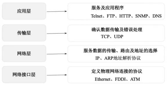 - 网络接口层(Network Access Layer):定义了主机间网络连通的协议,具体包括 Echernet、FDDI、ATM 等通信协议。