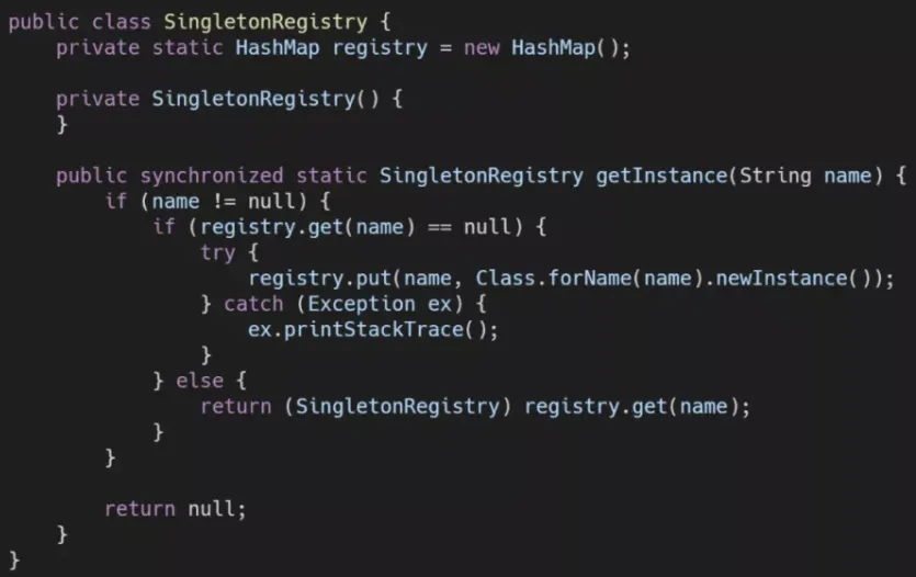其实实现原理很容易理解,以一个HashMap(Spring 是使用了线程安全的ConcurrentHashMap)来存储目前已生成的类的实例,如果可以根据类名找到对象,就返回这个对象,不再创建新对象。如果找不到,就利用反射机制创建一个,并加入到 Map 中。以上只是一个示意代码,作为 Spring 核心理念IoC的重要部分,单例注册表在 Spring 中的源码要复杂的多,也做了很多性能上的优化,具体可以参考 Spring 中AbstractBeanFactory类的源码。