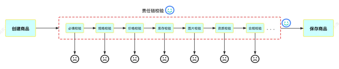 第②步校验商品又分为多种情况的校验,必填字段校验、规格校验、价格校验、库存校验等等。这些检验逻辑像一个流水线,要想创建出一个商品,必须通过这些校验。