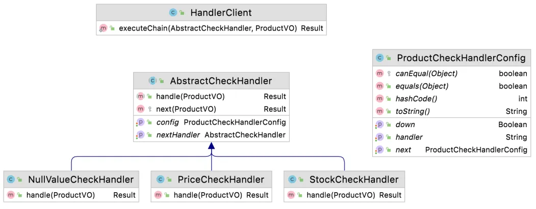 protected ProductCheckHandlerConfig config是处理器的动态配置类,使用protected声明,每个子类处理器都持有该对象。该对象用于声明当前处理器、以及当前处理器的下一个处理器nextHandler,另外也可以配置一些特殊属性,比如说接口降级配置、超时时间配置等。AbstractCheckHandler类中的nextHandler属性是当前处理器持有的下一个处理器的引用,当前处理器执行完毕时,便调用nextHandler执行下一处理器的handle()校验方法;protected Result next()是抽象类中定义执行下一个处理器的方法,使用protected声明,每个子类处理器都持有该对象。当子类处理器执行完毕(通过)时,调用父类的方法执行下一个处理器nextHandler。