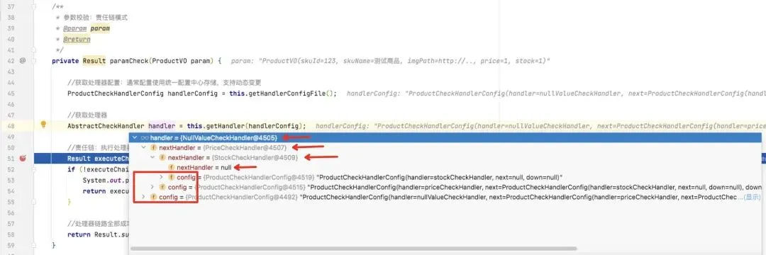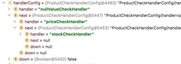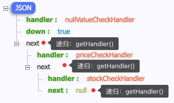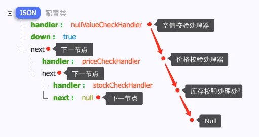 实际上,getHandler() 获取处理器对象的代码就是把在配置中心配置的规则 ConfigJson,转换成配置类 ProductCheckHandlerConfig 对象,再根据配置类对象,转换成实际的处理器对象,这个处理器对象持有整个链路的调用顺序。