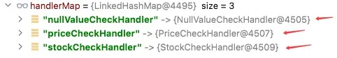 注入进来的 handlerMap 中 Key 对应 Bean 的 name,Value 是对应的 Bean 实例,也就是实际的处理器,这里指空值校验处理器、价格校验处理器、库存校验处理器。