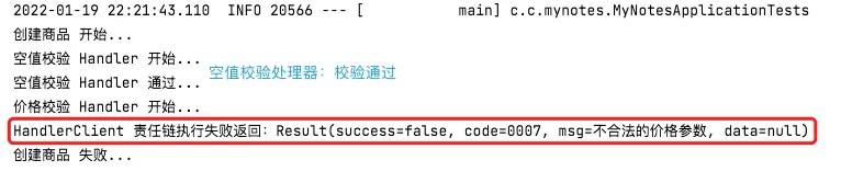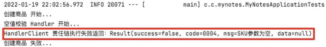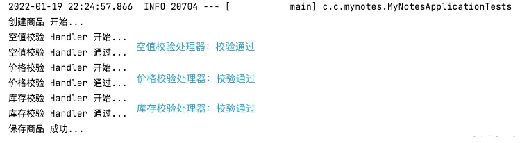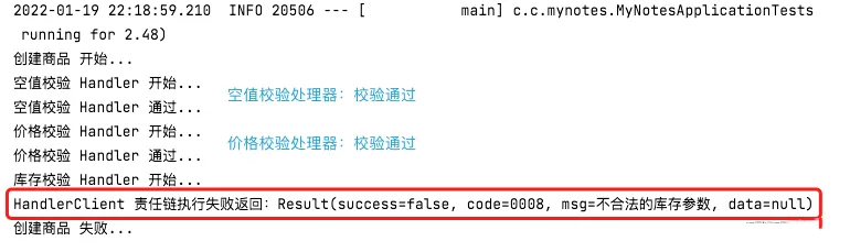 最后创建 createProduct() 测试用例方法,创建商品方法抽象为2个步骤:①参数校验、②创建商品。参数校验使用责任链模式进行校验,包含:空值校验、价格校验、库存校验等等,只有链上的所有处理器均校验通过,才调用 saveProduct() 创建商品方法;否则返回校验错误信息。