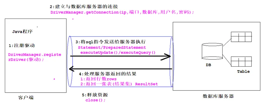 ResultSet 的 next() 和 getXxx(索引/字段名) 方法获得数据库返回的结果集。 - 必须关闭释放数据库资源,使用