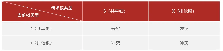 总结:S 锁和 S 锁是兼容的,S 锁和 X 锁是不兼容的,X 锁和 X 锁也是不兼容的