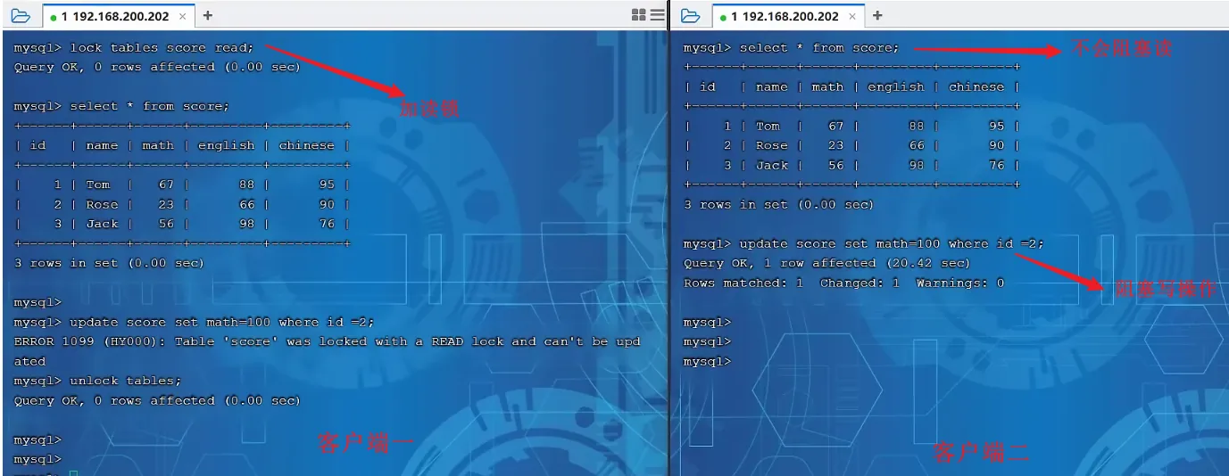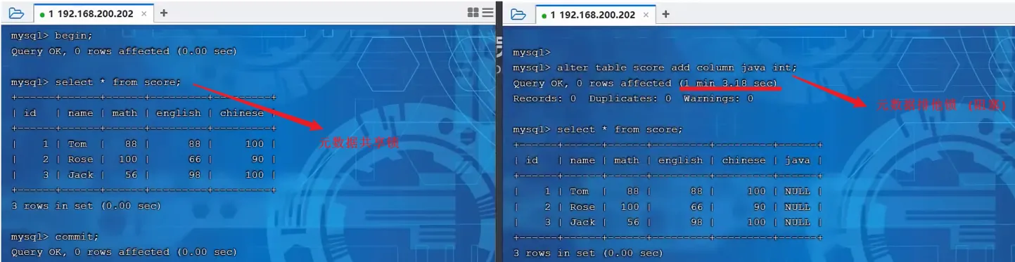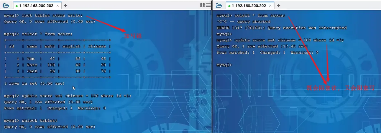 - 会话1执行以下语句,可以看到这个语句的执行将会被阻塞
