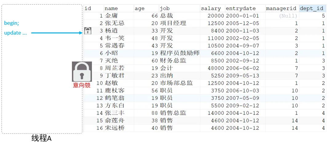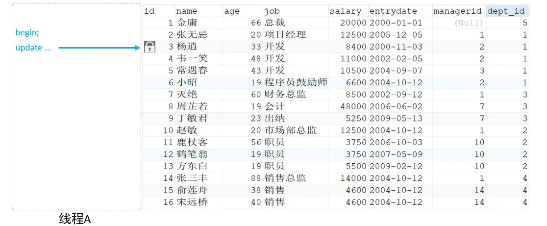 for update仅适用于 innodb,且必须在事务范围内才能生效。- 根据主键进行查询,查询条件为