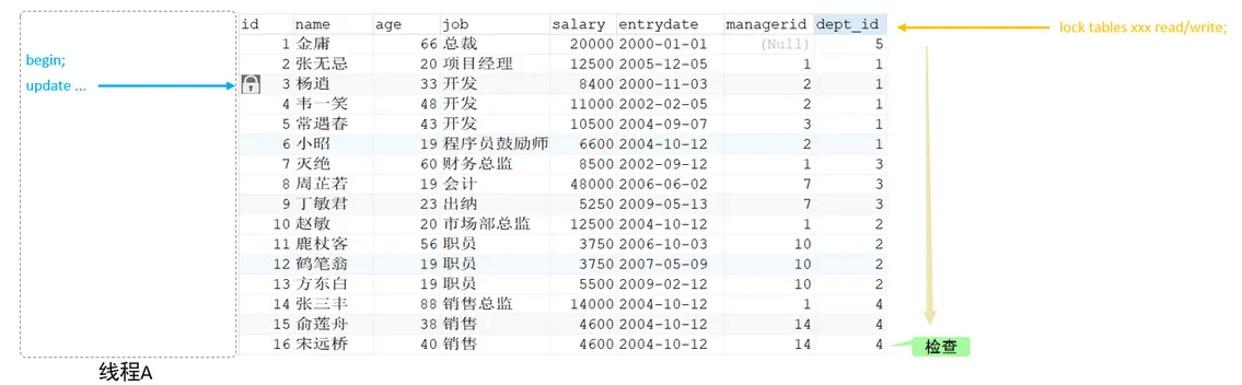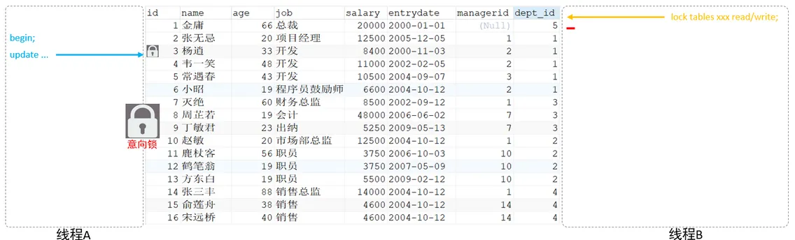 like或者不等于,主键字段产生表锁。 - 根据非索引字段进行查询,会产生表锁。