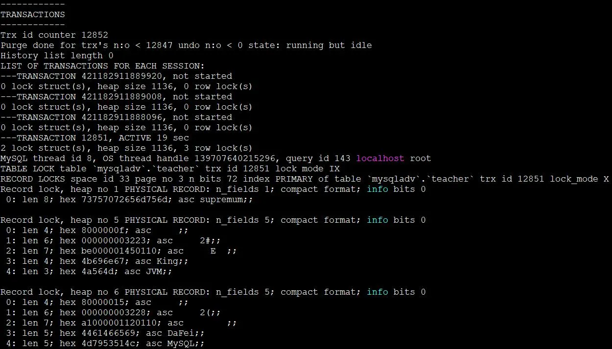 - 表示事务 ID 为 12851 对 mysqladv 下的 teacher 表加了表级意向独占锁。