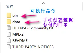 下载 zip 包后,解压即可。与安装版一样,其中 bin 目录包含了所有 mongodb 的可执行命令。mongodb 在运行时需要指定一个数据存储的目录,所以创建一个数据存储目录,通常放置在安装目录中,此处创建 data 的目录用来存储数据。解压缩与创建完毕后会得到如下文件:
