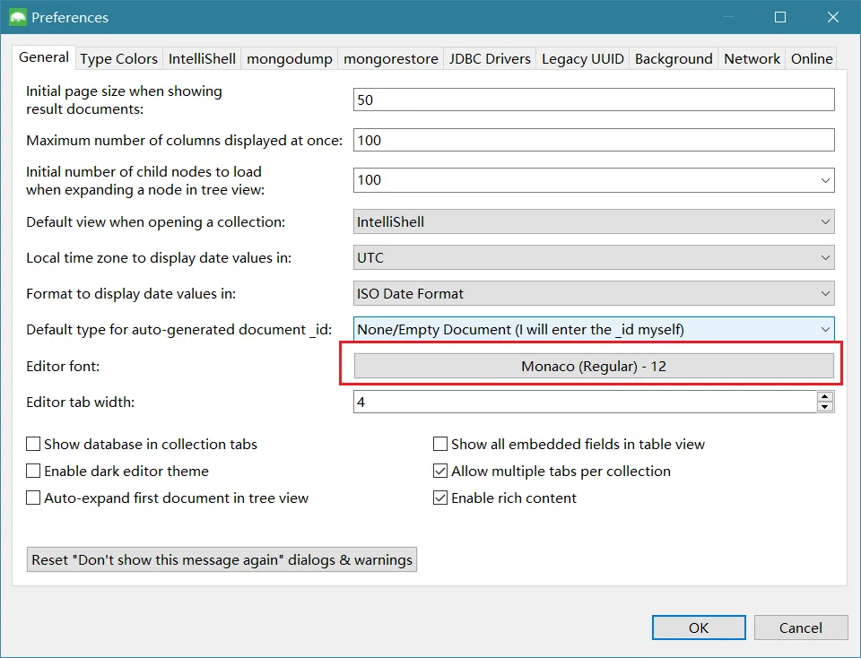 - 修改字体:默认Studio3t的字体太小,需要修改字体。点击菜单:Edit –> Preferences