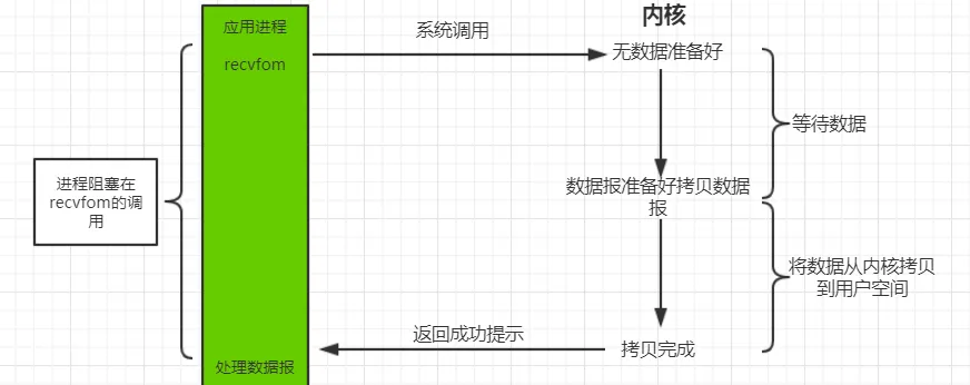 当用户线程发出 IO 请求之后,内核会去查看数据是否就绪,如果没有就绪就会等待数据就绪,而用户线程就会处于阻塞状态,用户线程交出 CPU。当数据就绪之后,内核会将数据拷贝到用户线程,并返回结果给用户线程,用户线程才解除 block 状态。典型的阻塞 IO 模型的例子为:data = socket.read();,如果数据没有就绪,就会一直阻塞在 read 方法的位置。