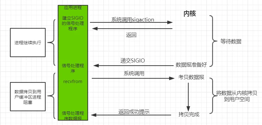 信号驱动 IO 模型的特点是:等待数据报到达期间进程不被阻塞。主循环可以继续执行,只要等待来自信号处理函数的通知。既可以是数据已准备好被处理,也可以是数据报已准备好被读取。