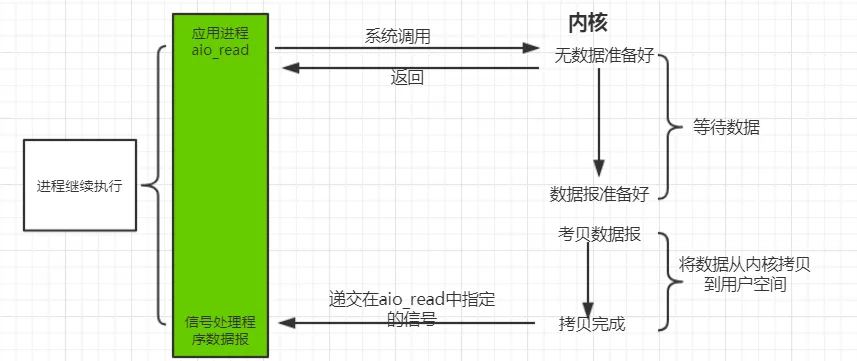 异步 IO 模型是最理想的 IO 模型,在异步 IO 模型中,当用户线程发起 read 操作之后,立刻就可以开始去做其它的事。而另一方面,从内核的角度,当它受到一个 asynchronous read 之后,它会立刻返回,说明 read 请求已经成功发起了,因此不会对用户线程产生任何 block。然后,内核会等待数据准备完成,再将数据拷贝到用户线程,当这一切都完成之后,内核会给用户线程发送一个信号,告诉它 read 操作完成了。也就说用户线程完全不需要实际的整个 IO 操作是如何进行的,只需要先发起一个请求,当接收内核返回的成功信号时表示 IO 操作已经完成,可以直接去使用数据了。