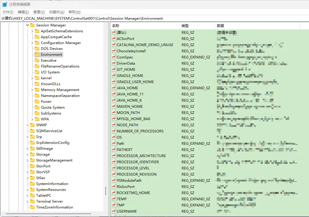注册表中系统变量所在位置:HKEY_LOCAL_MACHINE\SYSTEM\ControlSet001\Control\Session Manager\Environment