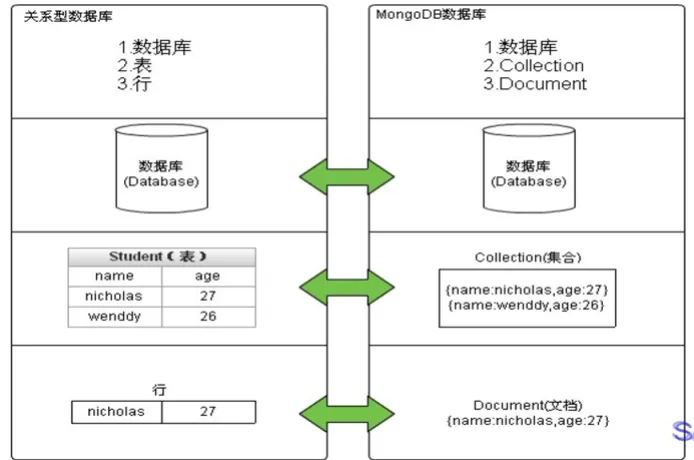 - MongoDB 的文档(document),相当于关系数据库中的一行记录。
