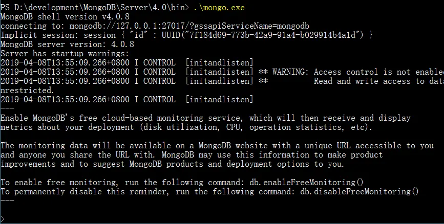 windows 版本的 mongodb 安装成功,在安装目录下的 bin 目录有 mongo.exe 客户端程序。进入 cmd 窗口执行 mongo.exe: