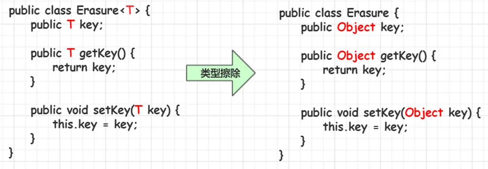 如在代码中定义的 List<Object> 和 List<String> 等类型,在编译之后都会变成 List。JVM 看到的只是 List,而由泛型附加的类型信息对 JVM 来说是不可见的。类型擦除的基本过程也比较简单,首先是找到用来替换类型参数的具体类,这个具体类一般是 Object,如果指定了类型参数的上界的话,则使用这个上界的类型,最后把代码中的类型参数都替换成具体的类。