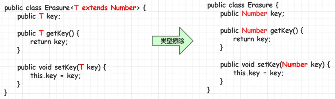 Java 中的泛型基本上都是在编译器这个层次来实现的。在生成的 Java 字节代码中是不包含泛型中的类型信息的。使用泛型的时候加上的类型参数,会被编译器在编译的时候去掉。这个过程就称为类型擦除。