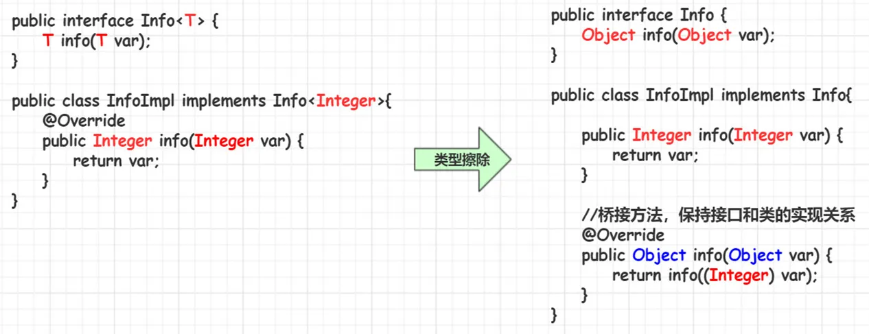 如果类型擦除和多态性发生了冲突时,则在子类中生成桥方法解决。
