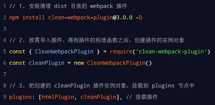 为了在每次打包发布时自动清理掉 dist 目录中的旧文件,可以安装并配置 clean-webpack-plugin 插件: