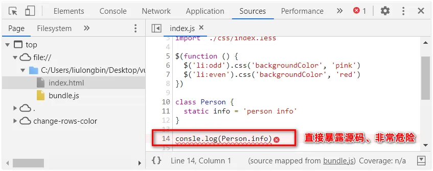 在生产环境下,如果省略了 devtool 选项,则最终生成的文件中不包含 Source Map。这能够防止原始代码通过 Source Map 的形式暴露给别有所图之人。