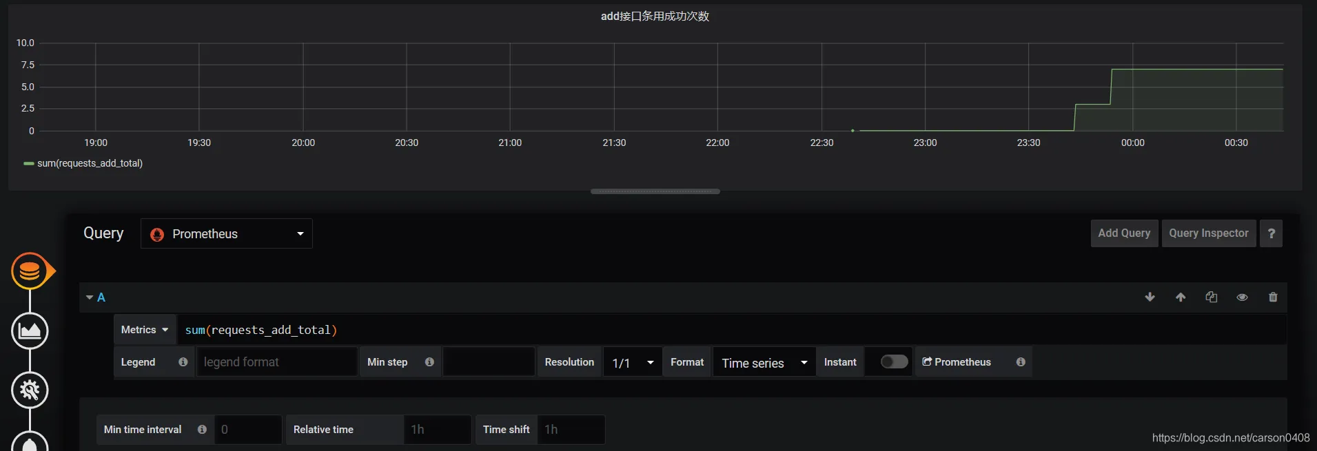 然后选中数据源,并进行metrics语句编写,如下图所示,sum(request_add_total) ,其中sum函数中的字段可以模糊搜索,只要prometheus中的服务是up的。然后图就如下所示,可以看出,调用情况: