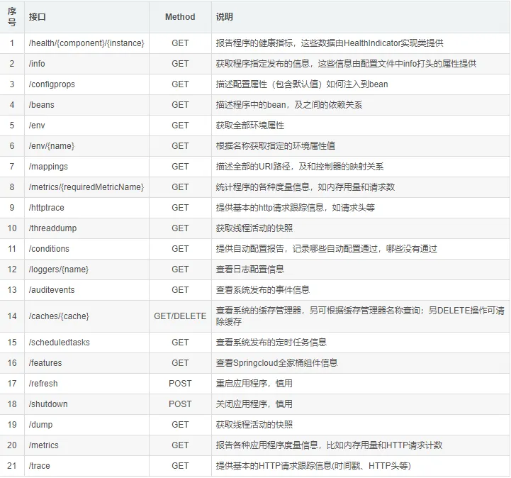 包含但不限于以下接口都是在开启 actuator 之后可以访问的(默认统一前缀 /actuator):